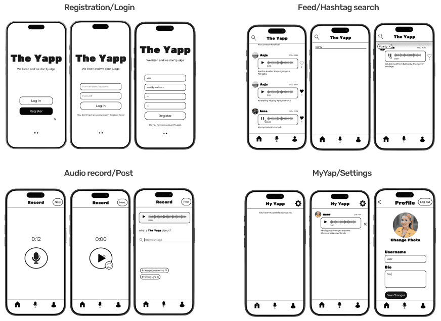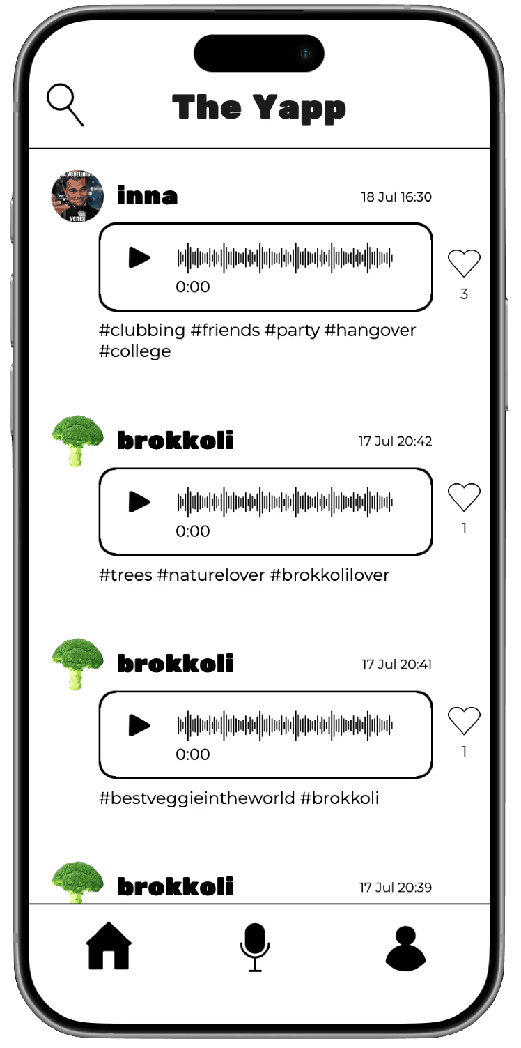 The project focuses on reducing visual pressure by prioritizing voice, encouraging users to share thoughts and stories without fear of judgment. Inspired by the phrase “We listen and we don’t judge,” popularized on TikTok, it presents a more intimate, audio-first alternative to traditional social media.